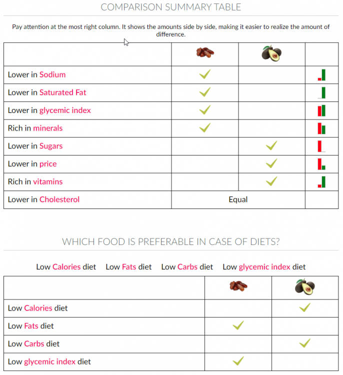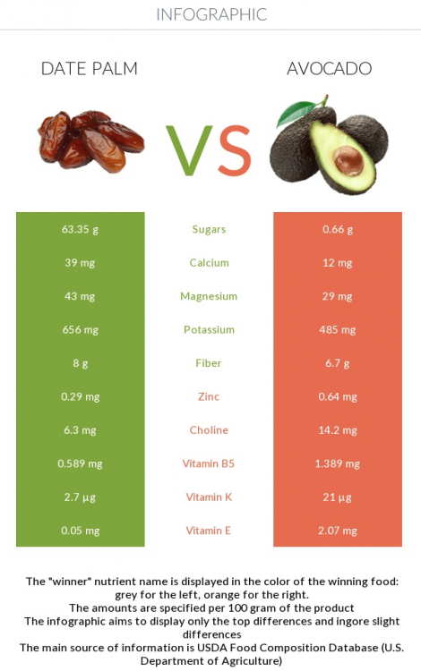 The USDA Food Composition Database found at the U.S. Department of Agriculture has all the comparison details, I find this web site makes it more visually friendly. Go to the link below for even more comparison info on these two. They actually break it down into a complete mineral, vitamin, protein, carbohydrates and fats comparison charts. Excellent way to help guide eating changes to live healthier. At the bottom is a list of other comparable items to the Date and Avocado. https://foodstruct.com/compare/dates-degletnoor-vs-avocado You can go here and pretty much compare any food to see how healthy it is. I like that they use the comparison food color to show which section that food wins in. No matter what, like everything, in moderation is the way to go and Dates and Avocado's have plenty of positive reasons to eat if you like the taste, texture and visual. For me, Awfulcado's turn me off by visual some, mostly taste and texture. Not happy in my mouth. Dates on the other hand I love. So go figure. I am also not a big fruit lover either. Will enjoy Watermelon, pears and peaches, but not much else.