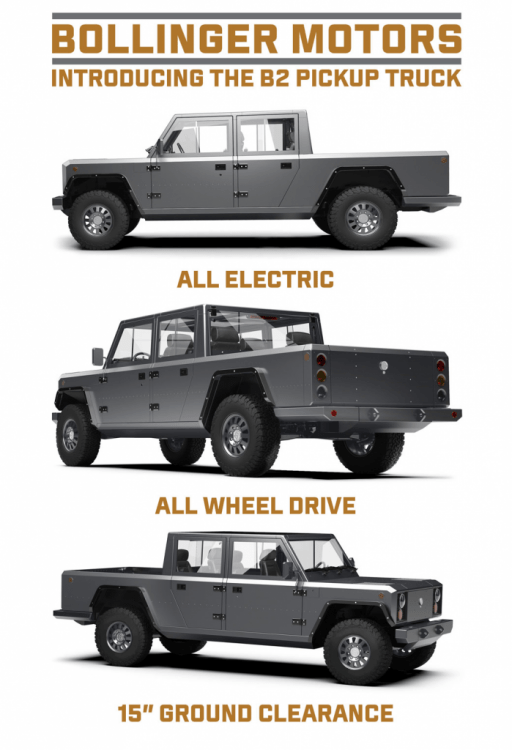 Bollinger Motors came onto the scene in 2017 with their 4 door AWD Sport Utility Truck. This truck designed on cad and then built and tested all over the US on road and off trail has proven itself so that the company has 20,000 plus reservation and growing for the 2020 production launch. Yet as they near engineering completion, they kept hearing from customers that asked if the truck could be built with a normal pickup size bed. Bollinger Motors Answer is the B2 Pickup Truck. Built on the outstanding work done for their shorter B1 Sport Utility Truck, the B2 was developed on the same DNA, using the same AWD dual motor, hydropneumatic suspension, in-wheel portal gear hubs, 120 kWh battery pack, large frunk space, and patented pass-through door for long items. B2 Pickup Truck Specifications: Bed is 4' 1" wide x 5' 9" long - Internal cab tailgate down, the truck can carry full 4' x 8' sheets of plywood. Total of 72 sheets of 1/2" plywood can be hauled. Rear glass opens up to the top of the cab. Class 3 work truck (10,001 Gross Vehicle weight rating) 520 Horsepower 514 lb-ft of torque 0 - 60 MPH in 6.5 seconds 100 MPH Top Speed 9.4 Power / weight Ratio Geared Axle hubs Tire size LT285/70/R17 11.75" Vented Brakes 4-Wheel Anti-lock Inboard Brakes 120 kWh battery pack with a 200 mile EPA range (est) 70.2 MPGe (est) Level 1 & 2 J1772 charging Ports for 110 & 220 V power Level 3 CCS Port Charging (DC Fast) Regenerative Braking 4800 LB Curb Weight 45 / 55 Weight Balance Dimensions 118.8" Wheelbase 171.5" Length 77.2" Width (no mirrors) 89" Width (with mirrors) 72.7" Height 66.2" Front and Rear Track 52 degree Approach Angle 30 degree Break Over Angle 43 degree Departure Angle 4 Passenger 113 Cubic ft of Cargo Capacity 13' Internal Length Front to Rear (Liftgates Closed) 16' 4" Internal Length Front to Rear (Liftgates Open) 14 cubic feet Frunk Storage Capacity 13" wide x 14" high patented pass through to Frunk 24 2x4s fit through the Passthrough Electric AWD All Aluminum Body Capability 15" Ground Clearance 10" Wheel Travel Up to 20" Variable Ground Clearance 5001 LB Payload Capacity 7500 LB Towing Capacity Front and Rear Winch option Plow Capable Bollinger Motors website Additional info on the B1 was published here: