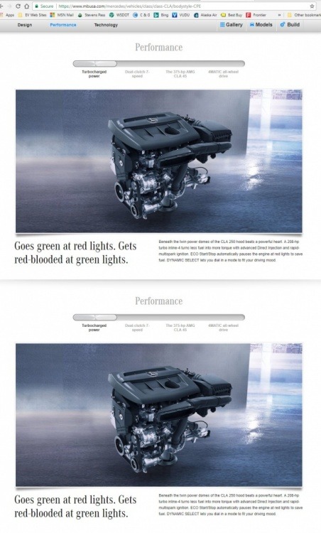 55hp more but needed to move an 400+ lbs of weight more. Interesting is if you go out and I wish I had thought of this earlier, but using Edmonds compare tool. WOW, Chevy gives you real Leather at 28K and for 33,6K MB can only give you Leatherette? plus yes MB has extra year on warranty but Chevy has extra year on powertrain, you start comparing them side by side and the CLA is blown away. https://www.edmunds.com/car-comparisons/?veh1=401717637&veh2=401717008