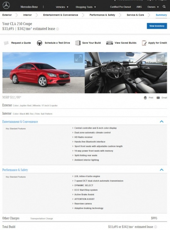 @Drew Dowdell @smk4565 So you guys made me curious to see the difference in the base CLA versus Cruze. What was interesting is that at $33,695 for the CLA you have a base car that is nothing special compared to so many superior options out there for the same money with much better packaging. In the Cruze, to get it identically configured to the CLA, I had to actually go with the Premier edition of the Cruze and still it came at $28,475. Considerable difference for the FWD Premier versus RWD CLA 250. Not really sure that most people other than looking for a badge would care to spend $5,220.00 more for what really is just a commuter car for most.