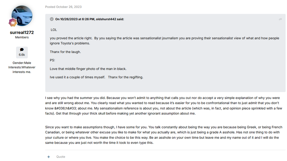 Tell me that Im phoquing wrong though...even if I use strong language. Yet another public shooting...a school shooting outside of school hours...but still. A phoquing highschool homecoming... https://www.cnn.com/2025/10/11/us/mississippi-leland-shooting https://www.cbsnews.com/news/4-dead-12-injured-in-mississippi-shooting-officials-say/ Four people were killed and at least 12 others were injured in a shooting early Saturday morning in Leland, Mississippi, officials said. Leland Mayor John Lee told CBS News the shooting happened around midnight, and four of the injured people were airlifted to local hospitals. There was no immediate information about their condition. There are no suspects in custody and the investigation is ongoing. The shooting happened on a main street, Lee said. People were in town for Leland High School's homecoming game, he said. The Leland School District website shows that Leland High School was set to play a homecoming game against Charleston High School. Leland is a small city in Washington County. It had a population of about 4,000, according to 2020 census data. I was and still am VERY aggressive towards the US, towards ccap, towards ANYTHING resembling American. And I will CONTINUE to be! This was the last time I had a conversation with you...all on the account of you defending Toyota. Toyota and you went all phoquing shytty. So you are the LAST person to whine about personal attacks. My attacks are about what YOUR piece of shyte country is trying to do to mine. MY anger is filled because when gun violence NEEDS to be made, ccap went all snowflakey on me because I didnt exactly wish Charlie Kirk death, but I wasnt closed on the idea that he got shot and well...he phoquing died and well...live by the sword and die by it. CCAP claims that he didnt know too much about Charlie Kirk, but had an opnion of why Charlie was a "good" guy fighting for a "just" cause... Phoque off with Charlie, with CCAP and everything that represesnts MAGA. PHOQUE OFF with ALL Americans ALLOWING this kind of hatred and fascism to CONTINUE to exist. PHOQUE YOU because ALL this shyte is ALSO affecting MY country!!! And when YOUR shytty president is going all out fascist on you phoques, ccap asked me slyly on what Id do to curb gun violence... I told you what is supposed to be done. He calls me insufferable. Ironically, another school shooting. 4 dead. Probably mostly highschoolers. On the eve of a football homecoming game. Tell me that I was wrong about stating that Americans are too childish, too immature, to stupid, not empathetic and sympathetic to human deaths, too phoquing EVERYTHING (ALL NEGATIVE ADJECTIVES)...to own guns. ITS NOT ABOUT GUN SAFETY or MENTAL HEALTH checks. The WHOLE LOT OF YOU NEED TO BE CHECKED FOR MENTAL ILLNESS!!! That means NONE of you phoques should be owning guns! @surreal1272 Instead of being a police dog in here, go organize a NO KING rally against your president and in the meantime, write to your senator in South Carolina to tell phoque-a-zoid Trump to lay off the 51st State rhetoric and keep Canada out of his pedophile-fraudulent mouth. Go on and cry about THAT instead! Whine about releasing of the Epstein Files and the lack thereof and fight for your brotherhood from ICE agents and the National Guards in LA, Washington DC, Chicago and every other shytehole city that you call a city in the United States of SHYTTY America!!!