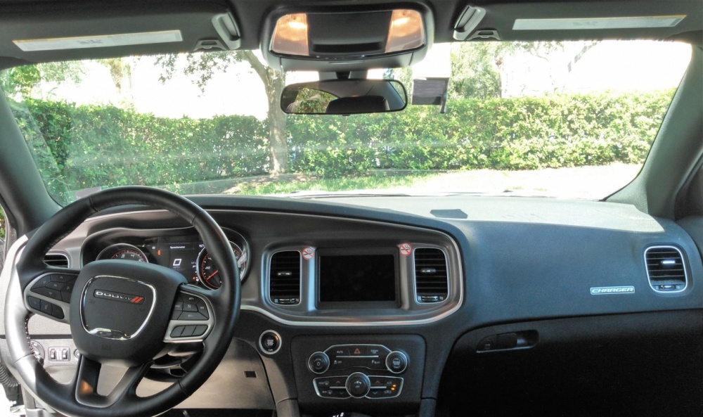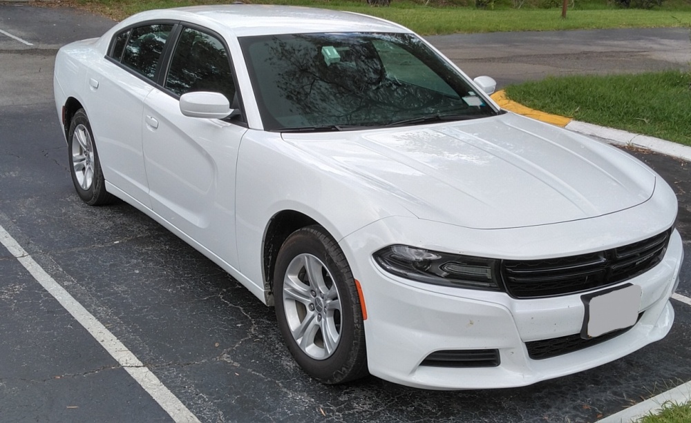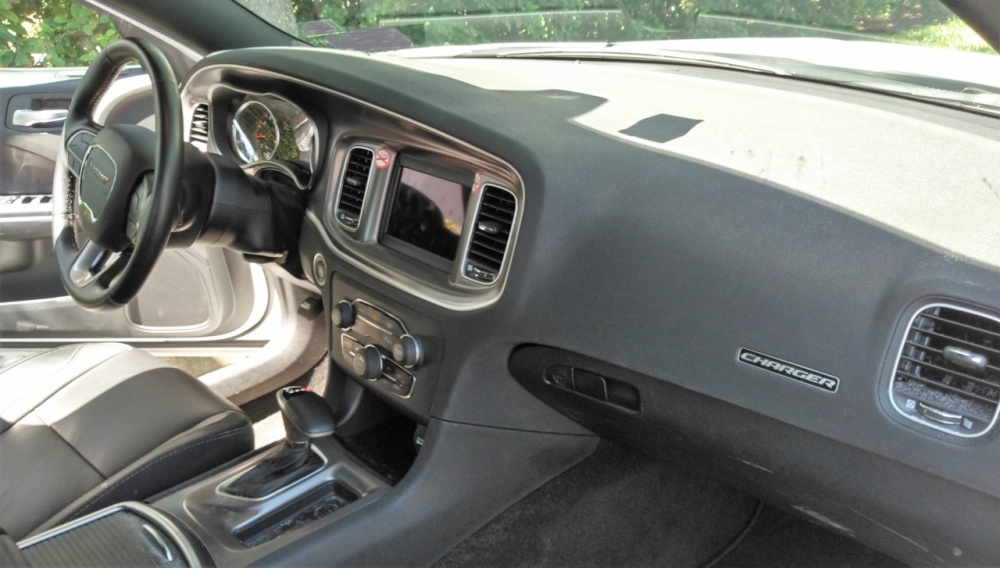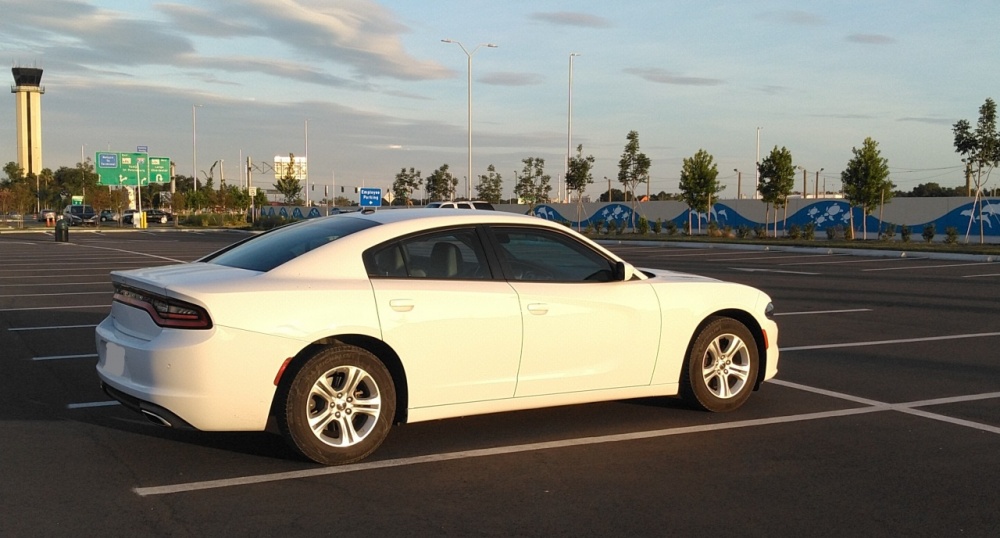 PHOTOS - Exterior and mechanical Here's a sleek looking Dodge Charger with the Tampa Sunshine Skyway Bridge in the background, taken from Fort De Soto An angled rear three quarter view of the Dodge Charger Great lines ... and the latest rear light bar is the best design to come along The latest grille looks clean, sort of merges with the headlamps, and works well blacked out An "aerial view" of the Dodge Charger Engine bay: 3.5 Pentastar V6 - 292 hp - in RWD set up ... big air intake, small battery area (unless they've stashed it elsewhere), strut towers (with black grommets at the top) ... more or less symmetrically laid out, with room to reach things Driver's side view of the engine bay - oil fill cap, coolant recovery bottle, brake fluid (and master cylinder?) under the black rubber lid (at the right) ... but I couldn't find the transmission fluid dipstick (not sure if this is a sealed unit) Passenger's side view of the engine bay ... looks like 3 direct injection ports on this side of the engine bank, battery hookups here, up front (but the battery may be elsewhere since it looks shallow, just like they did with the last-gen Pontiac Bonneville) ... what was surprising was that the engine sat higher and more forward than in old school RWD cars ... maybe that is because of the rack and pinion system (not sure) Touche'. Just in case you don't know the brand and model of car whose hood you were raising up ... - - - - - End of exterior and mechanical photos