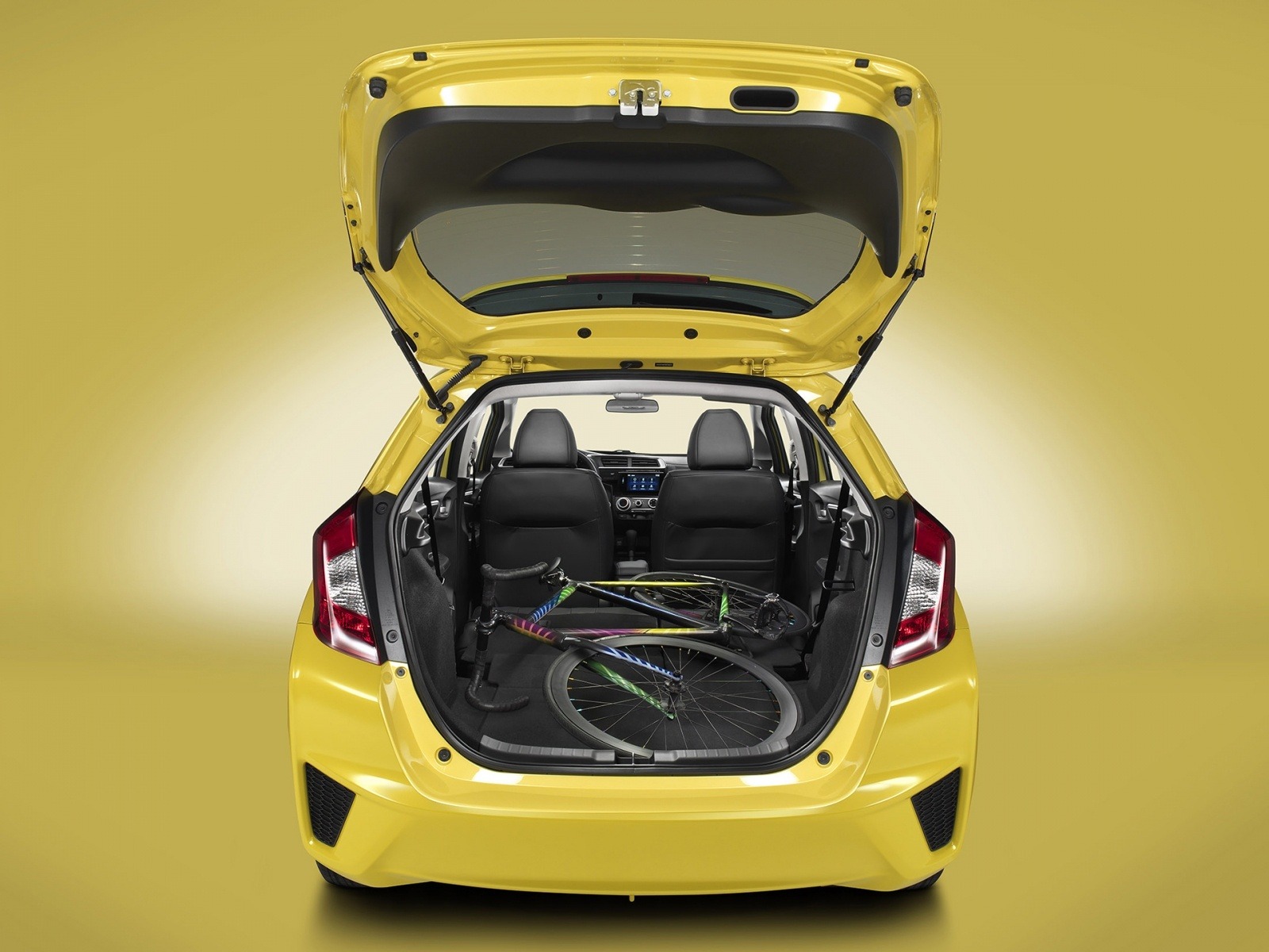 The 2015 Honda Fit EX-L in yellow with the rear hatch open, demonstrating the Magic Seat cargo flexibility by fitting a full-size bicycle inside the hatchback.