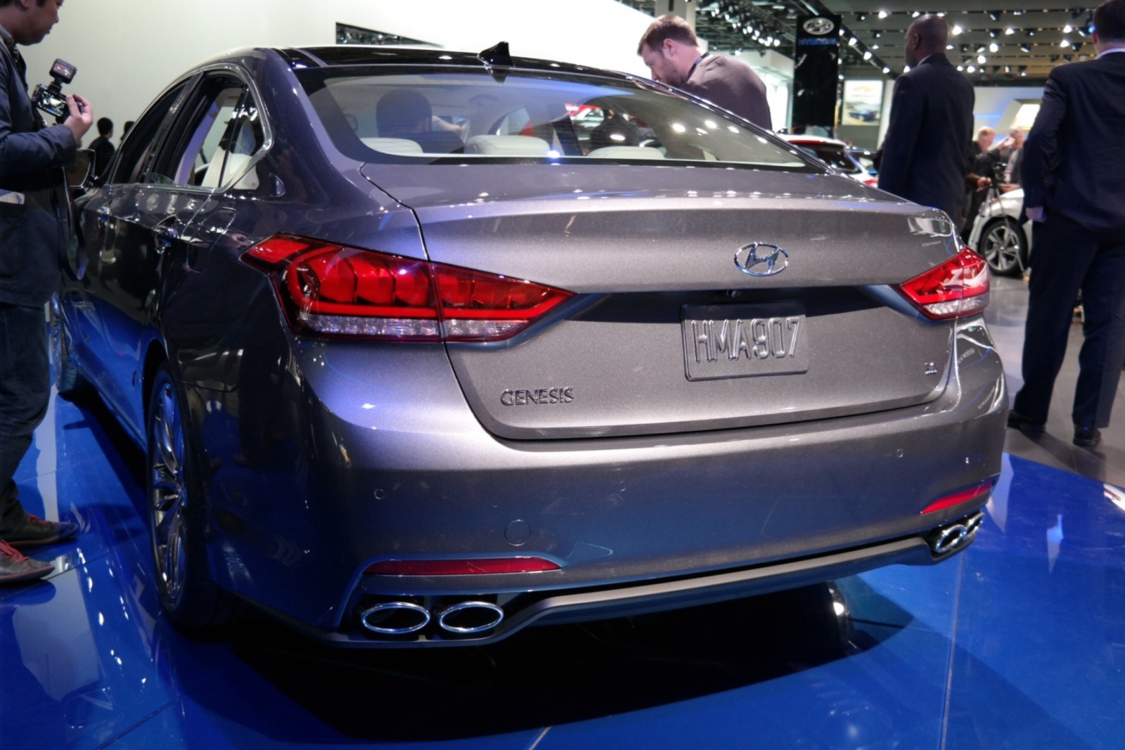 The rear of the 2015 Hyundai Genesis 3.8 shows a clean, upscale design with LED taillights, quad exhaust tips, and a subtle Genesis badge on the trunk lid. The wide haunches and integrated trunk spoiler give the sedan a poised, confident appearance from behind.