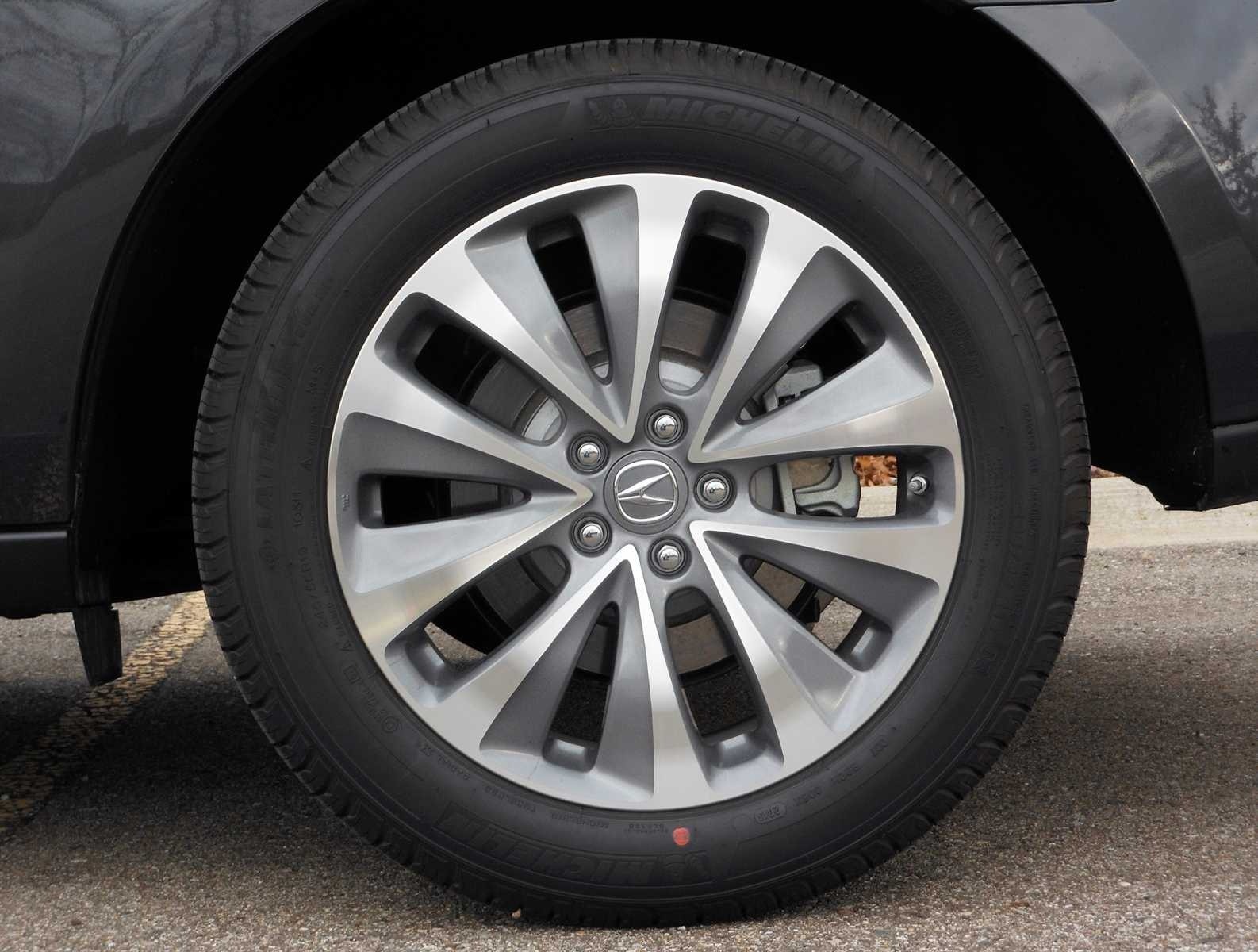 A closeup of the 2014 Acura MDX's 18-inch split 10-spoke alloy wheel in a silver finish, with the Acura center cap and brake rotor visible through the open spokes. The wheel is mounted on the graphite luster metallic SUV.