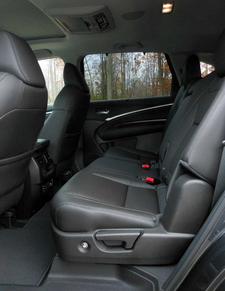 The second row of the 2014 Acura MDX Tech with Entertainment package shows three black leather seats with contrast stitching. The doors are open revealing adequate headroom and the rear door panel with wood-grain trim inserts.