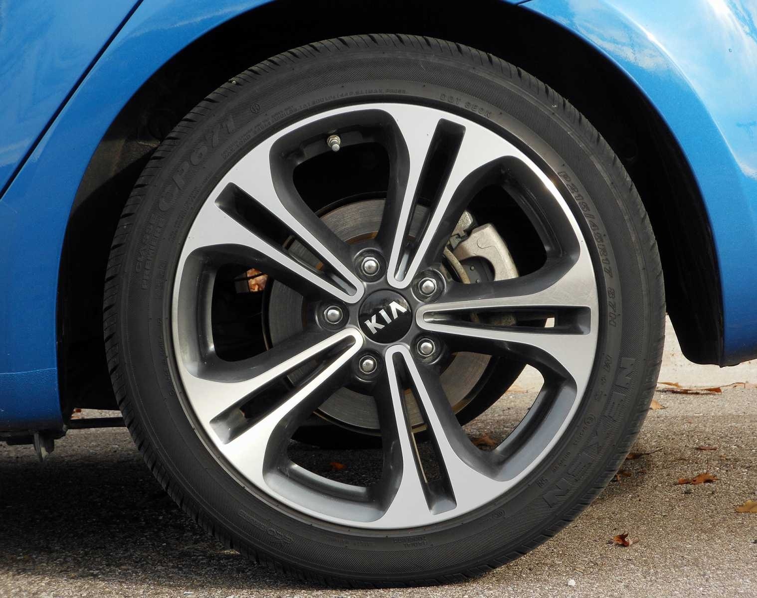 Closeup of the 2014 Kia Forte EX's 17-inch machined-face dark spoke alloy wheel with Kia center cap.