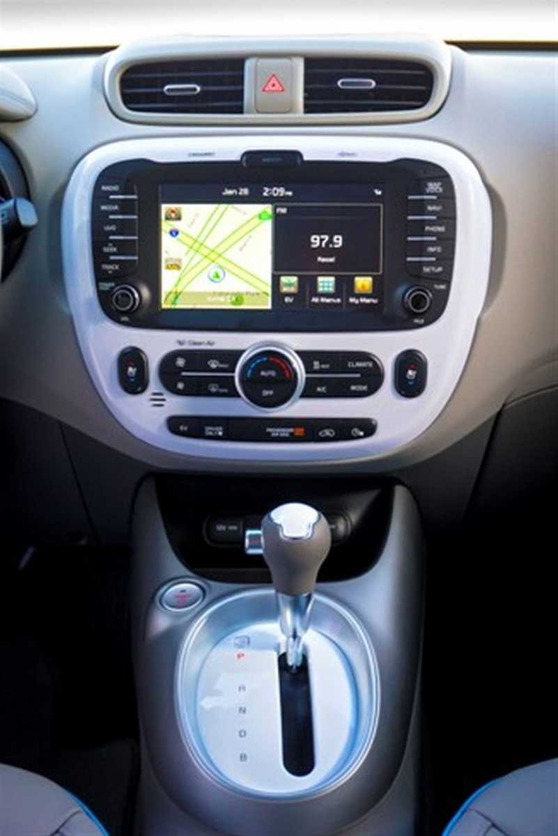 Center stack of the 2015 Kia Soul EV showing the navigation display, infotainment touchscreen, climate dial, and automatic gear selector with EV-specific controls.