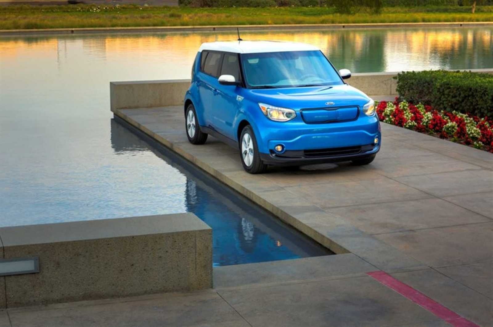 The blue 2015 Kia Soul EV parked on a narrow waterfront plaza at dusk, with reflecting pools on either side and flower gardens in the background. The press photo showcases the hatchback's front-end design and compact proportions in an elegant outdoor setting.