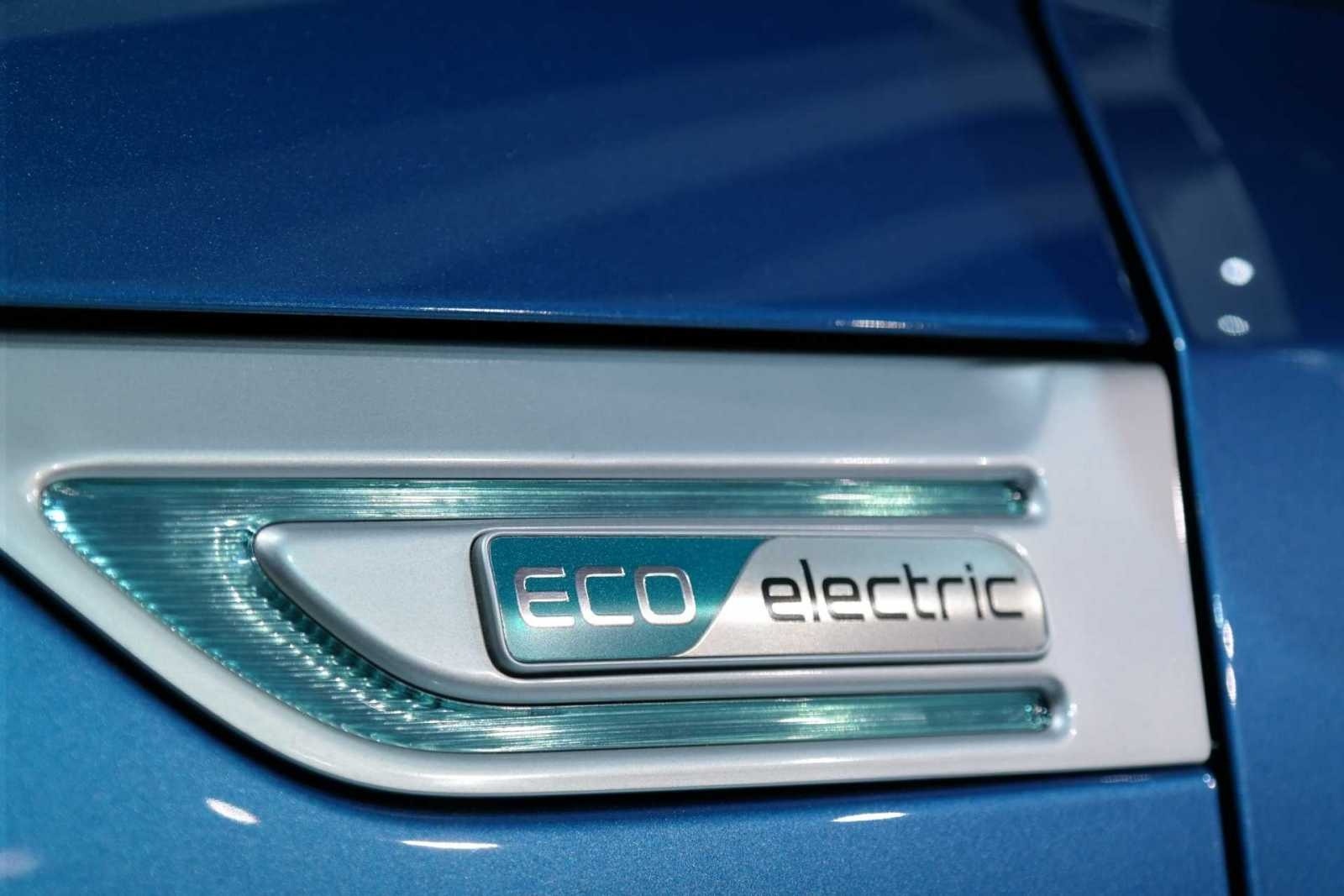 A close-up of the "eco electric" fender badge on the blue 2015 Kia Soul EV, featuring a silver and teal accent design that identifies this Soul as the all-electric variant. The badge is mounted on the front door panel just ahead of the door handle.