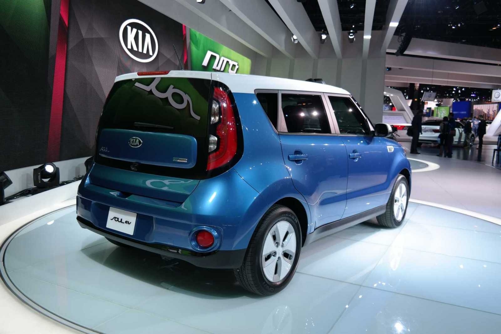 The rear three-quarter view of the blue 2015 Kia Soul EV at an auto show with Kia branding in the background. The two-tone blue and white exterior with the white roof contrasts with the boxy body shape and distinctive Soul EV rear styling.