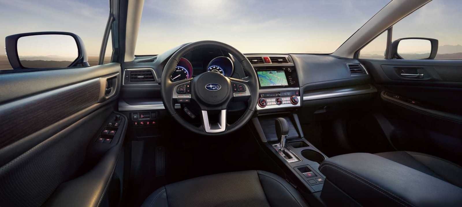 The 2015 Subaru Legacy Limited's redesigned interior features a clean, driver-focused dashboard layout with wood grain trim, a touchscreen STARLINK infotainment display, and a leather-wrapped steering wheel with integrated controls. Dark leather seating and an intuitive center console round out the upscale feel of the cabin.