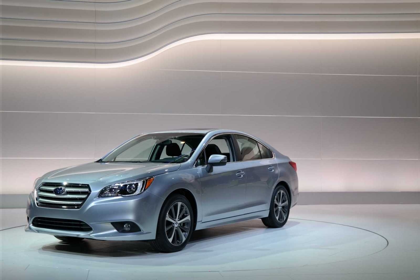 The 2015 Subaru Legacy sits on an illuminated turntable at its auto show reveal, showcasing the wide grille, projector headlights, and clean hood lines against a wave-pattern light display backdrop. The silver-blue exterior highlights the sedan's contemporary proportions.
