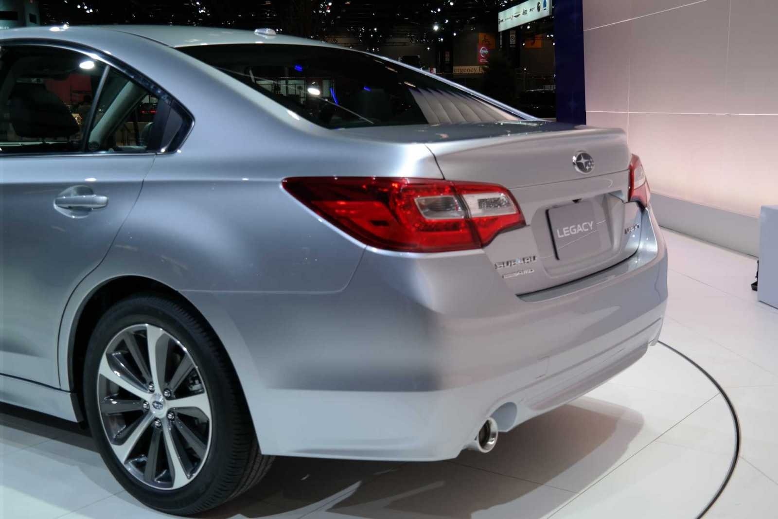 A close-up rear view of the 2015 Subaru Legacy on the Chicago Auto Show floor reveals the redesigned LED-style taillights, prominent "LEGACY" trunk badge, and a clean bumper with integrated exhaust tip. The sculpted trunk lid and quarter panels give the rear end a more premium, European-influenced look.