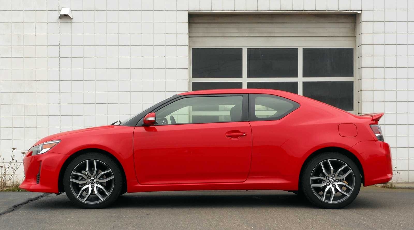 A direct side profile of the 2014 Scion tC in red, revealing the coupe's swooping roofline, wide C-pillar, rear spoiler, flush door handles, and 18-inch alloy wheels. The clean two-door body is photographed against a white-tile industrial building.