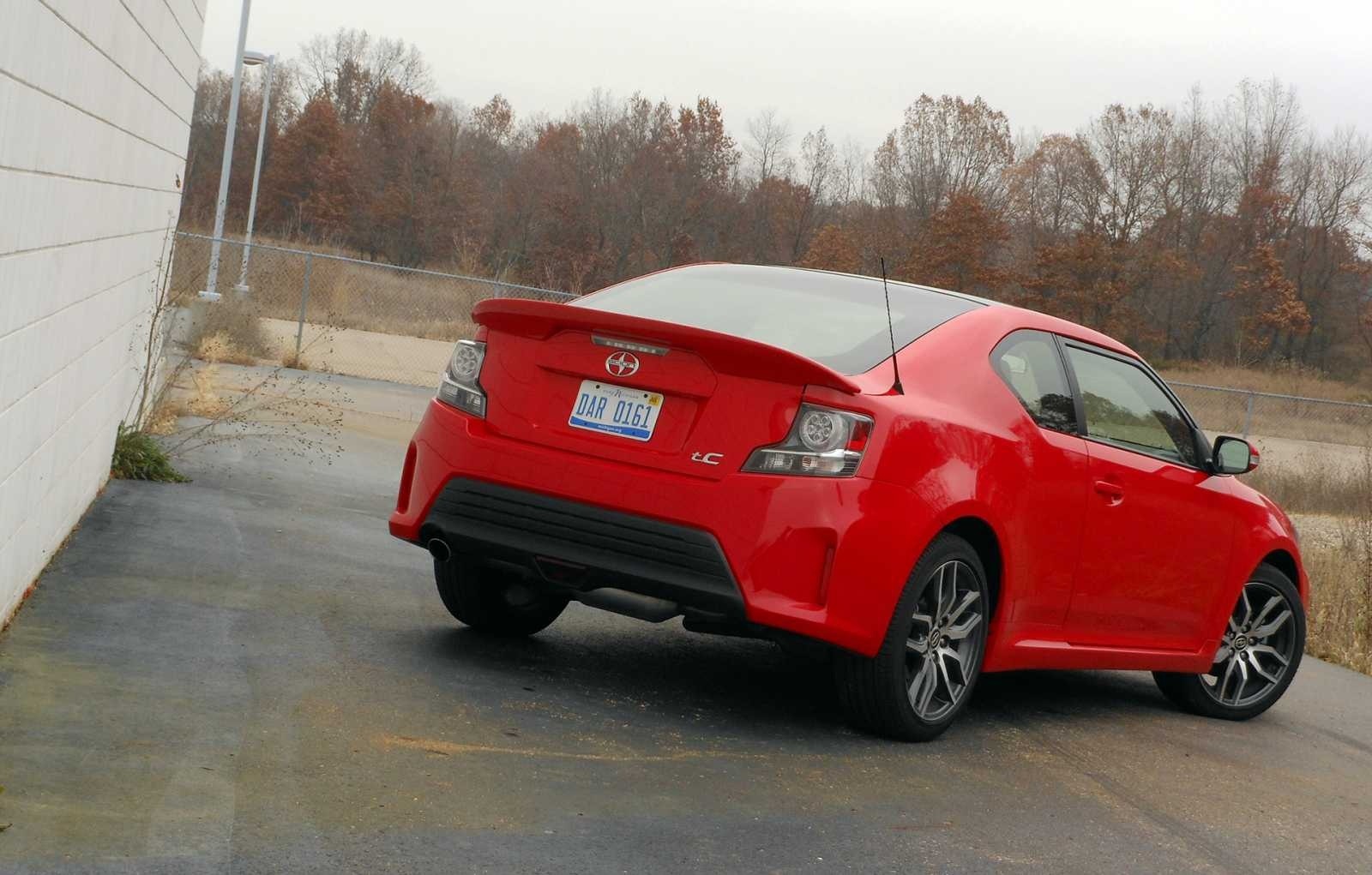 A three-quarter rear view of the 2014 Scion tC in red showing the coupe's fastback roofline, integrated rear spoiler, round taillights with "tC" badge, center-exit exhaust, and 18-inch alloy wheels. The car is photographed against bare autumn trees.