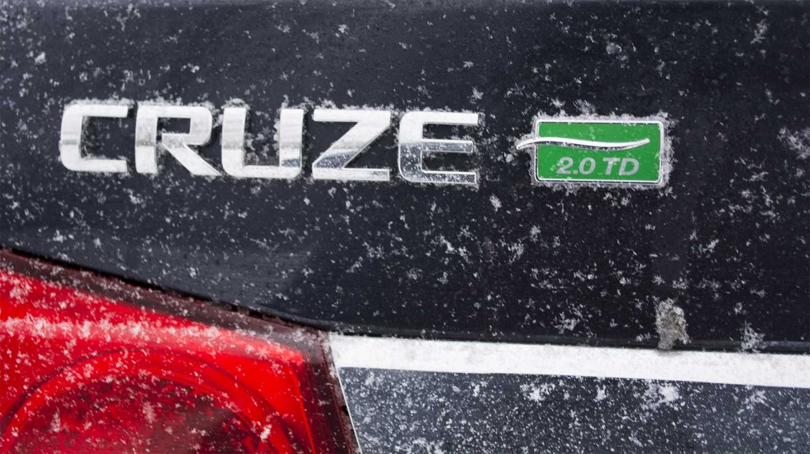 Closeup of the decklid on the 2014 Chevrolet Cruze Turbodiesel, showing the CRUZE lettering and the green 2.0 TD diesel badge that identifies this as the turbodiesel variant.
