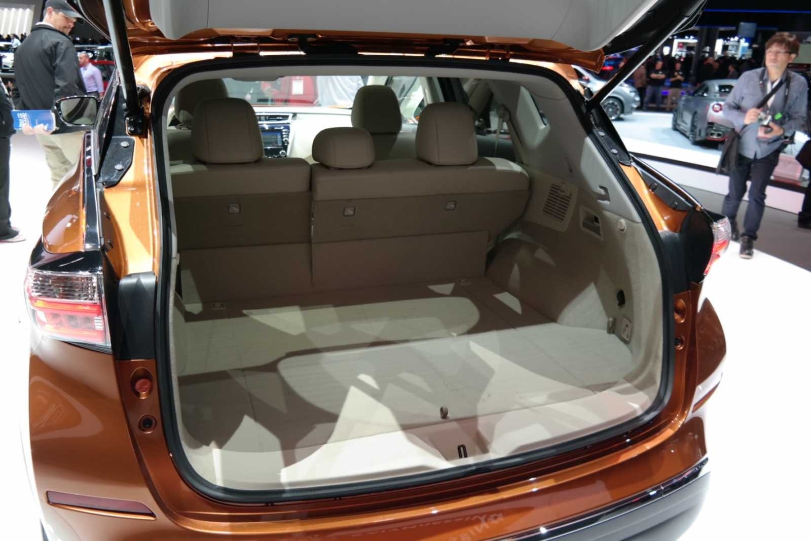 The 2015 Nissan Murano SL's power liftgate is raised to reveal the spacious cargo area with a flat, light-colored load floor and the rear seat headrests visible in the background, all framed by the warm bronze exterior paint.