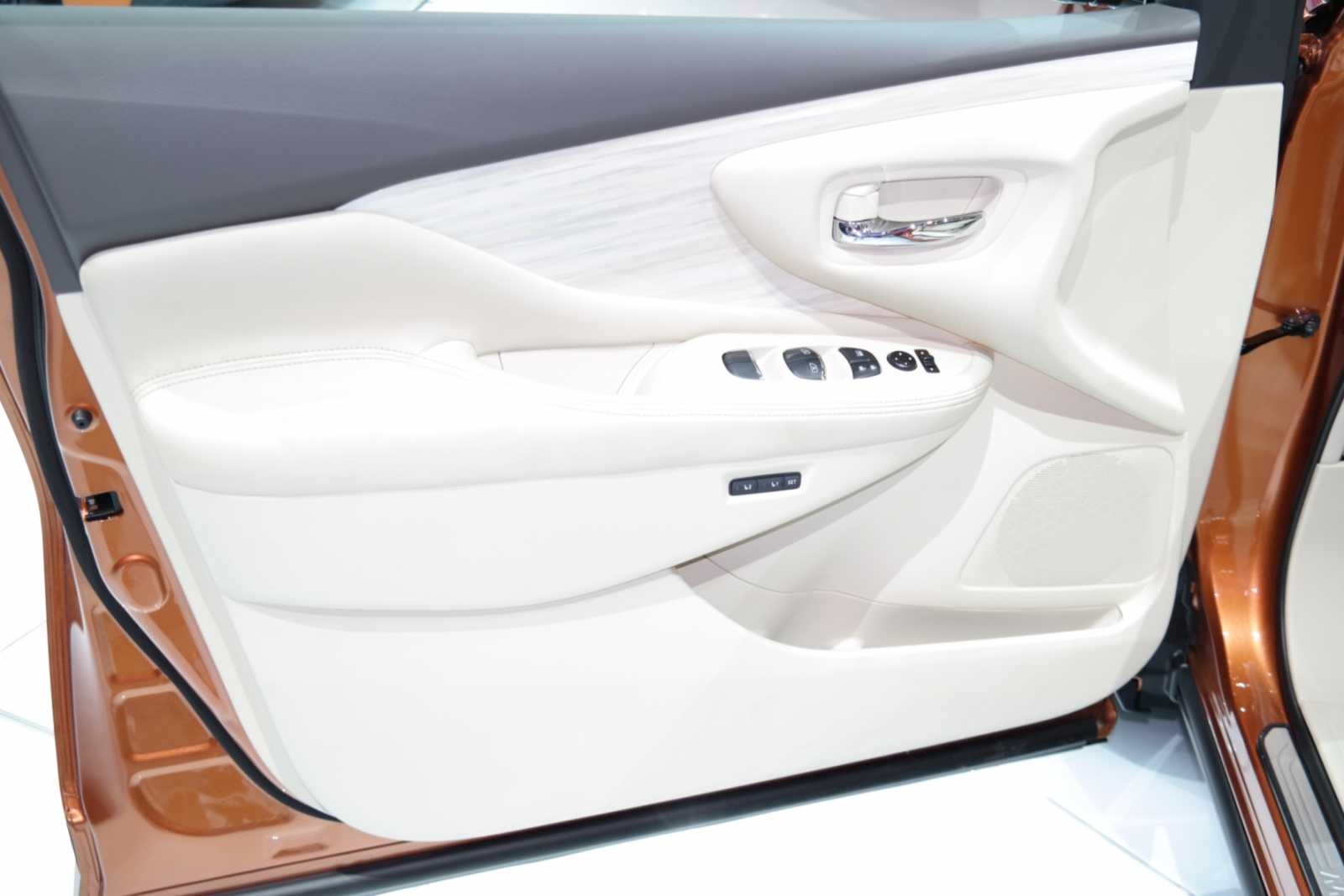A slightly wider view of the 2015 Nissan Murano SL's front door panel reveals the full extent of the sculpted cream leather armrest and padding, power window switch cluster, and mirror controls integrated into the panel's flowing design.