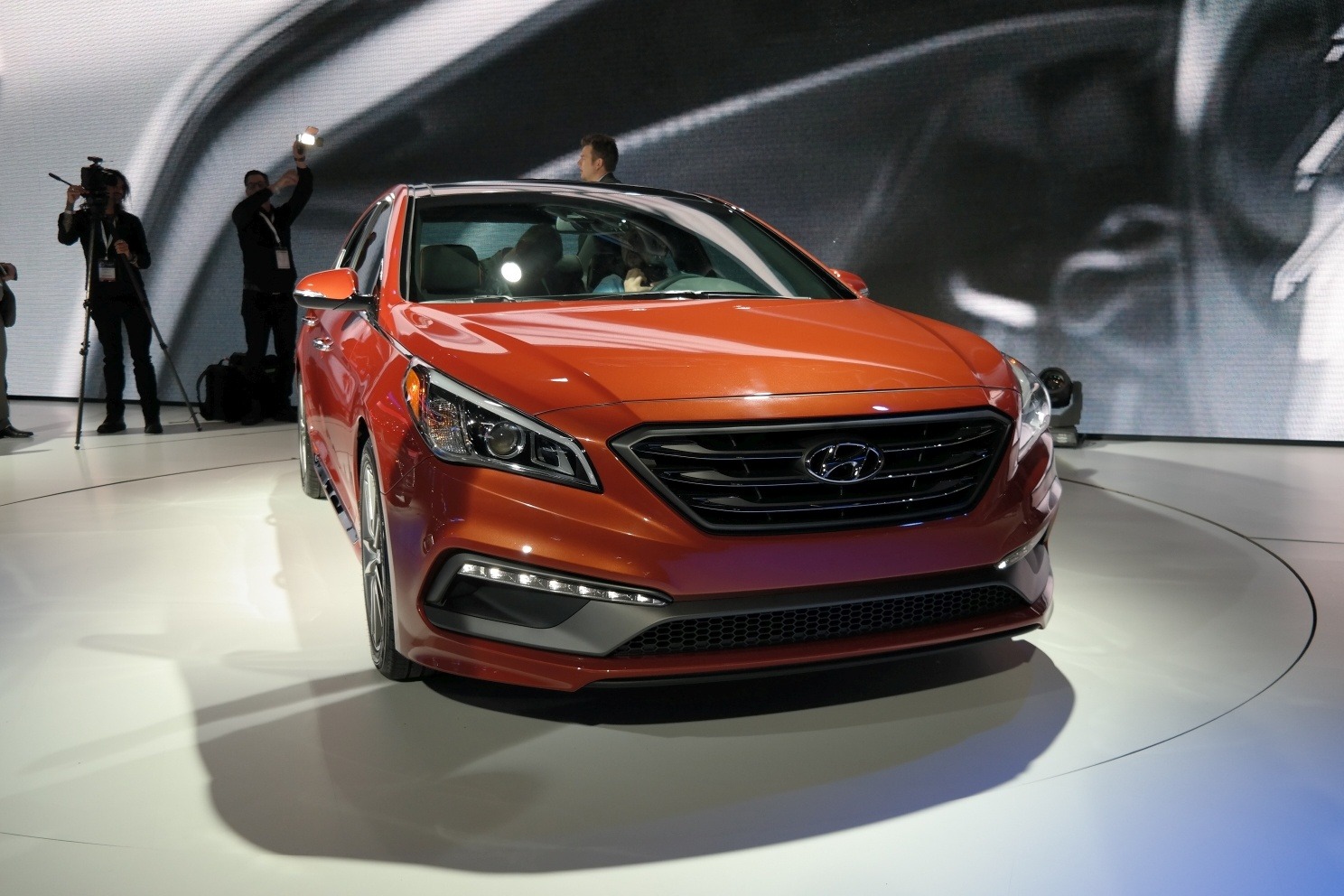 The 2015 Sonata Sport rotates on the auto show turntable as media photographers capture its debut, showcasing the redesigned front fascia with projector headlights and LED running lights. The orange metallic finish draws attention across the show floor.