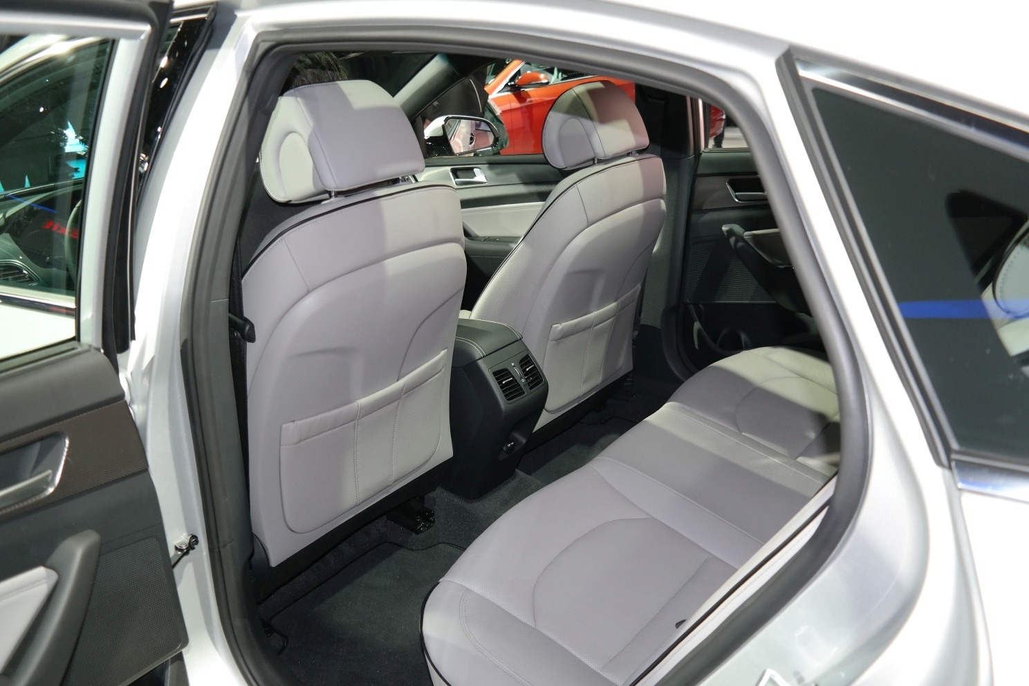 The rear seating area of the 2015 Hyundai Sonata features light gray cloth upholstery with generous legroom visible, photographed at an auto show with a silver model visible in the background.