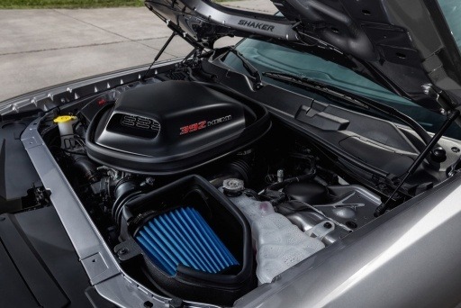 2015 Dodge Challenger SRT 392 engine bay with 6.4-liter HEMI V8 and Shaker scoop