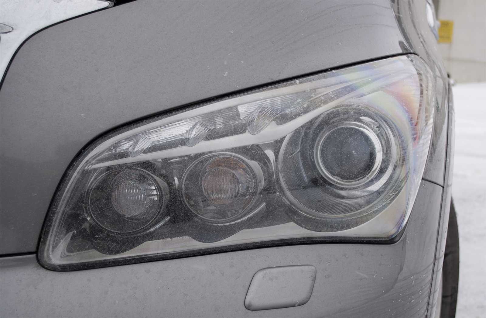 The 2014 Infiniti QX80 uses a distinctive triple-projector headlamp assembly wrapped in a smoked housing for a sophisticated appearance. The three-lens arrangement provides broad illumination coverage befitting a full-size luxury SUV.