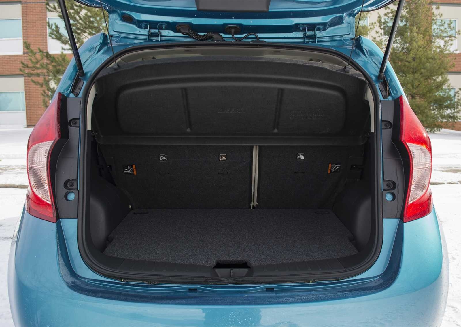 The hatchback is shown open with a spacious flat black cargo floor and seat fold release straps visible at the rear of the cabin.