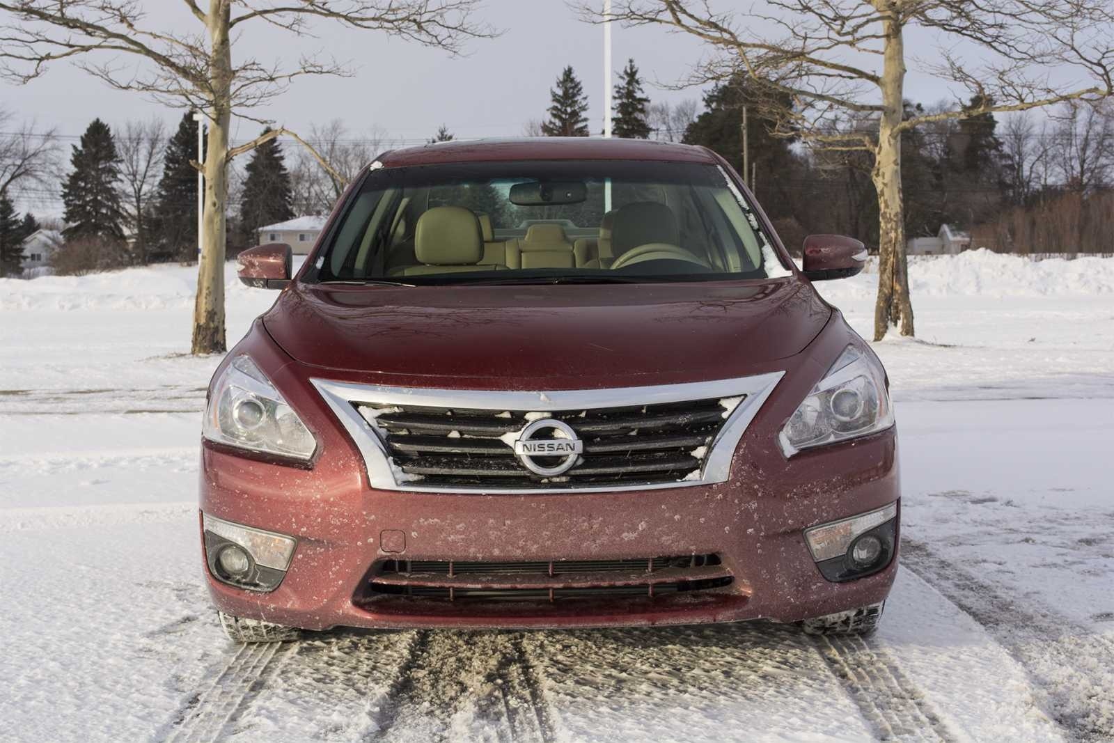 Straight-on front view of the dark red Altima 2.5 SL on a snowy road, displaying the full-width V-motion grille, Nissan badge, and projector headlights. Bare winter trees are visible in the background.