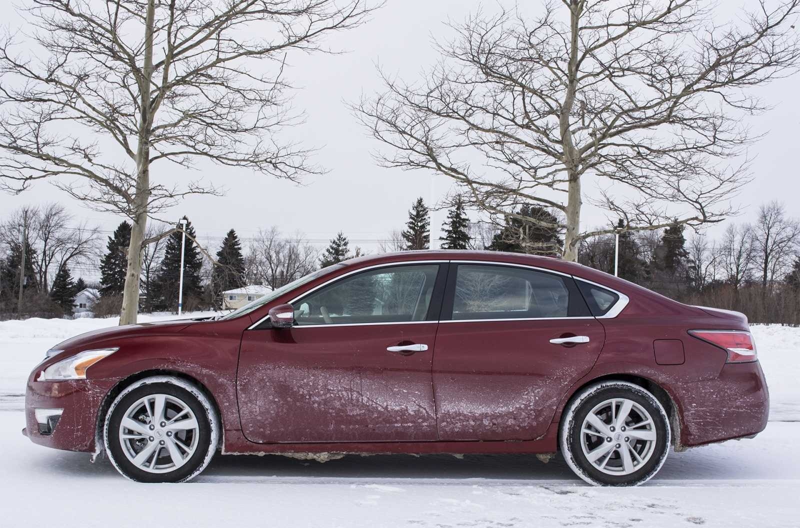 The side profile of the 2014 Nissan Altima 2.5 SL shows the sedan's long, flowing roofline, pronounced character line along the lower body, and SL-spec alloy wheels dusted with road salt and snow. The fastback-influenced silhouette gives the Altima a more aerodynamic and sporting appearance than many of its midsize sedan competitors.