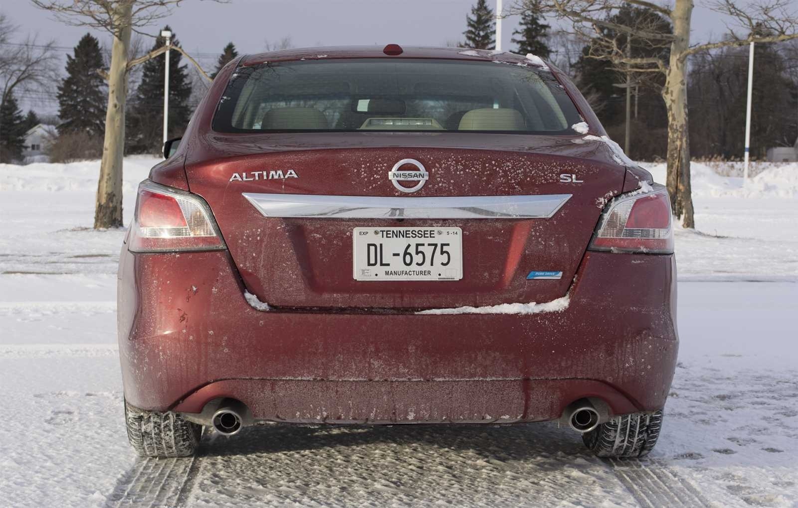 Straight-on rear view of the dark red Altima 2.5 SL on a snowy road, showing the full rear fascia with Altima and SL badges, chrome strip, and dual exhaust tips. Winter trees line the background.