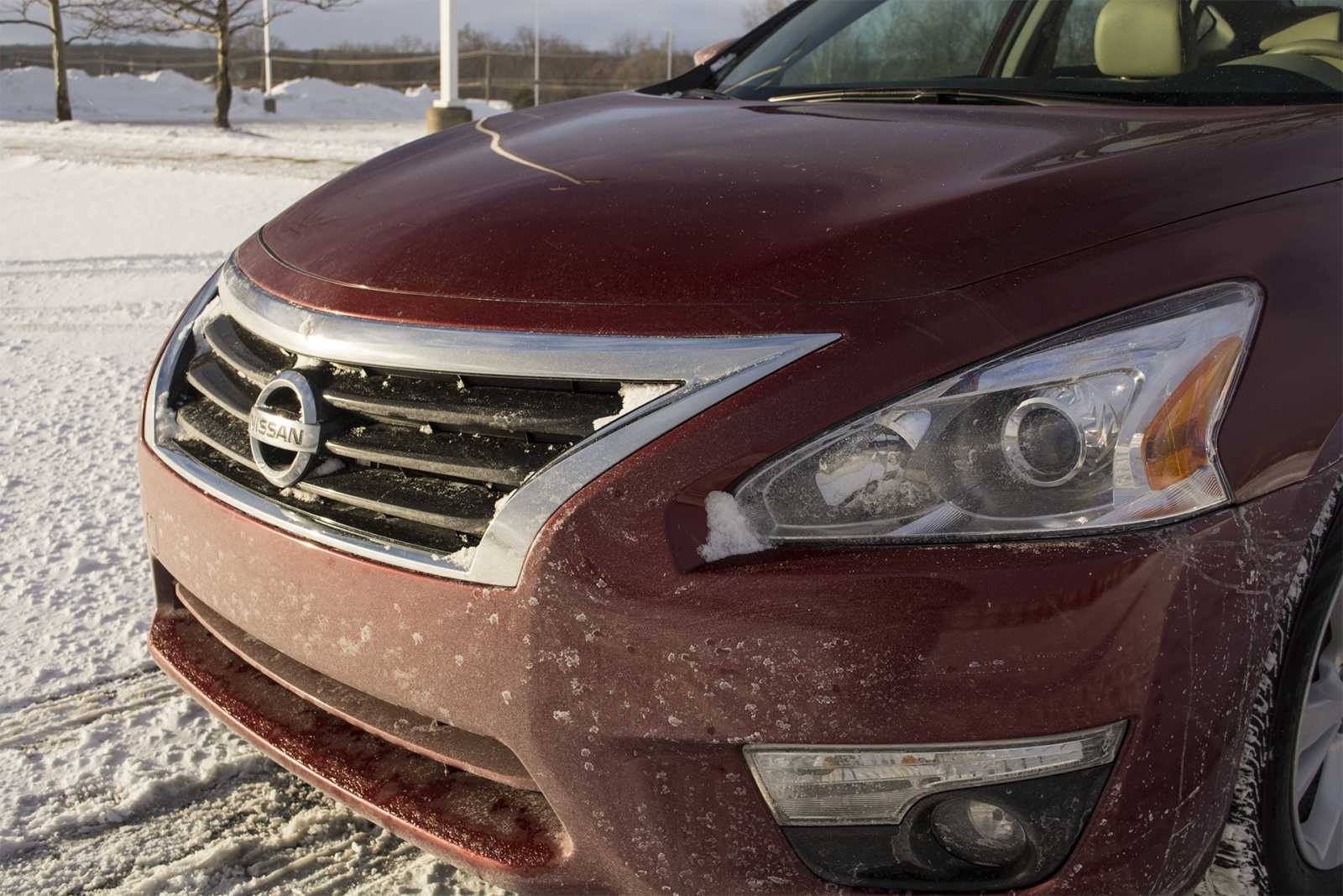 A close-up of the 2014 Nissan Altima 2.5 SL's front corner shows the V-motion grille with horizontal chrome slats and a Nissan badge, alongside a projector-style headlight with an integrated amber turn signal. Road salt and snow on the front fascia confirm this was photographed in winter driving conditions.
