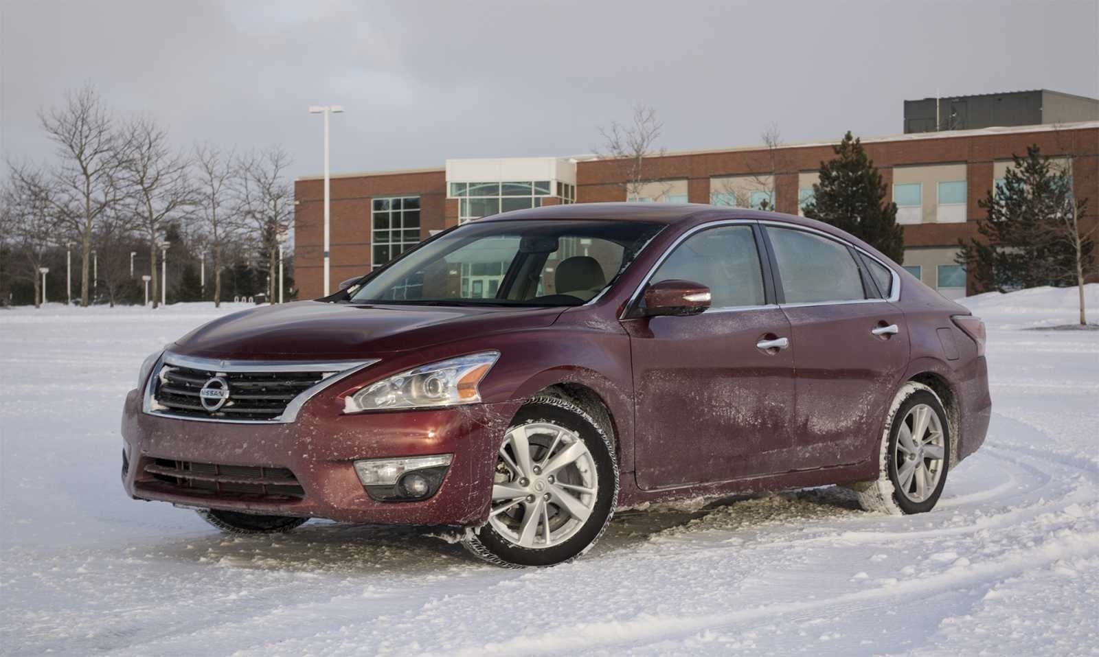 The dark red Altima 2.5 SL is positioned in a snowy lot with a commercial building visible in the background. The front three-quarter angle showcases the sedan's V-motion grille, swept headlights, and clean body lines.