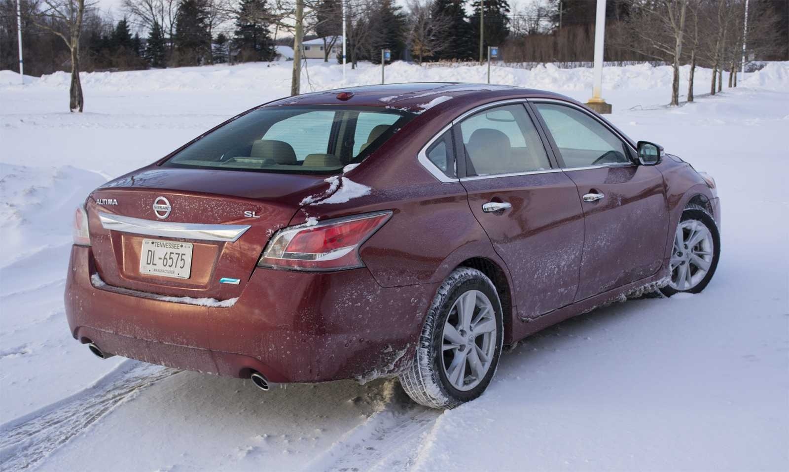 The 2014 Nissan Altima 2.5 SL is shown from the rear driver's side in snow, revealing the sedan's clean trunk and taillights from a wider angle than the straight-on rear shot. The flowing roofline's fastback-style slope into the trunk lid is clearly visible here, along with the Altima and SL badges centered on the decklid.
