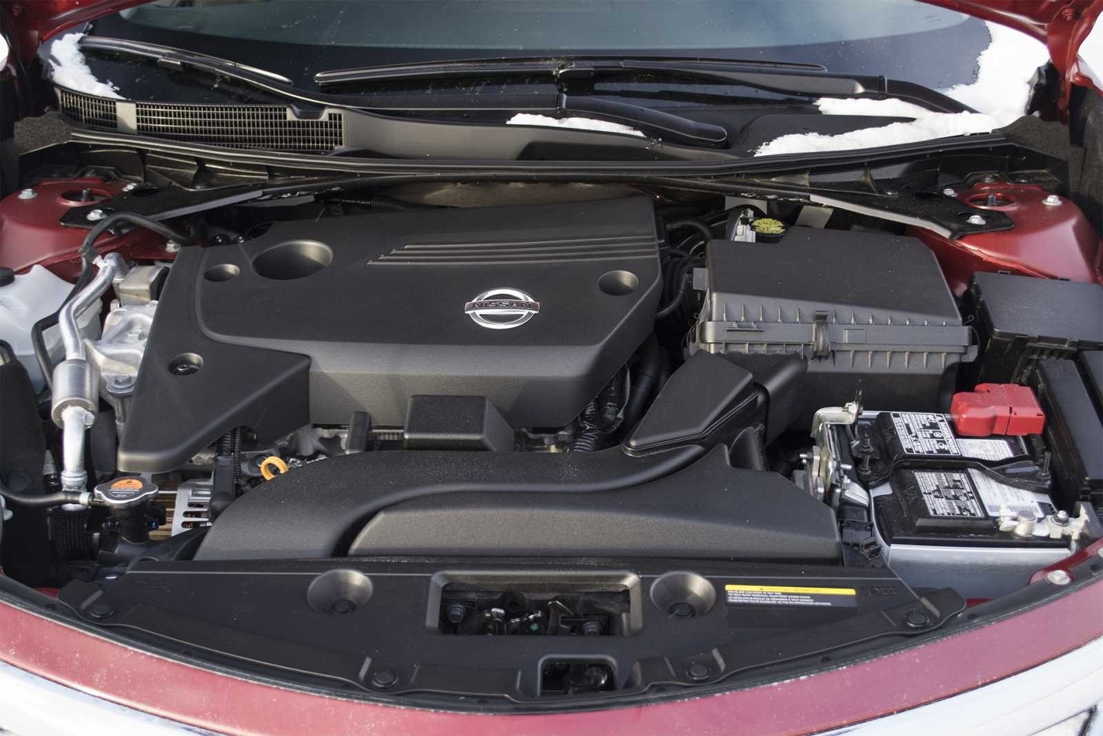 The engine compartment of the Altima 2.5 SL shows the 2.5-liter four-cylinder engine with the Nissan logo prominently displayed on the engine cover. The bay is photographed in winter conditions with snow visible on the body panels.