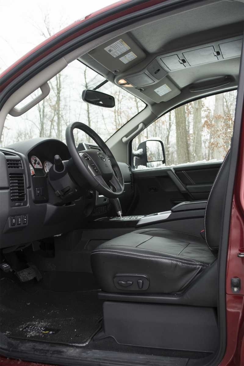 The 2014 Nissan Titan Pro-4X's front interior features a black leather-trimmed driver's seat with contrast stitching, a chunky steering wheel, and a straightforward instrument panel. The spacious cab and dark headliner give the cabin a utilitarian but comfortable feel.
