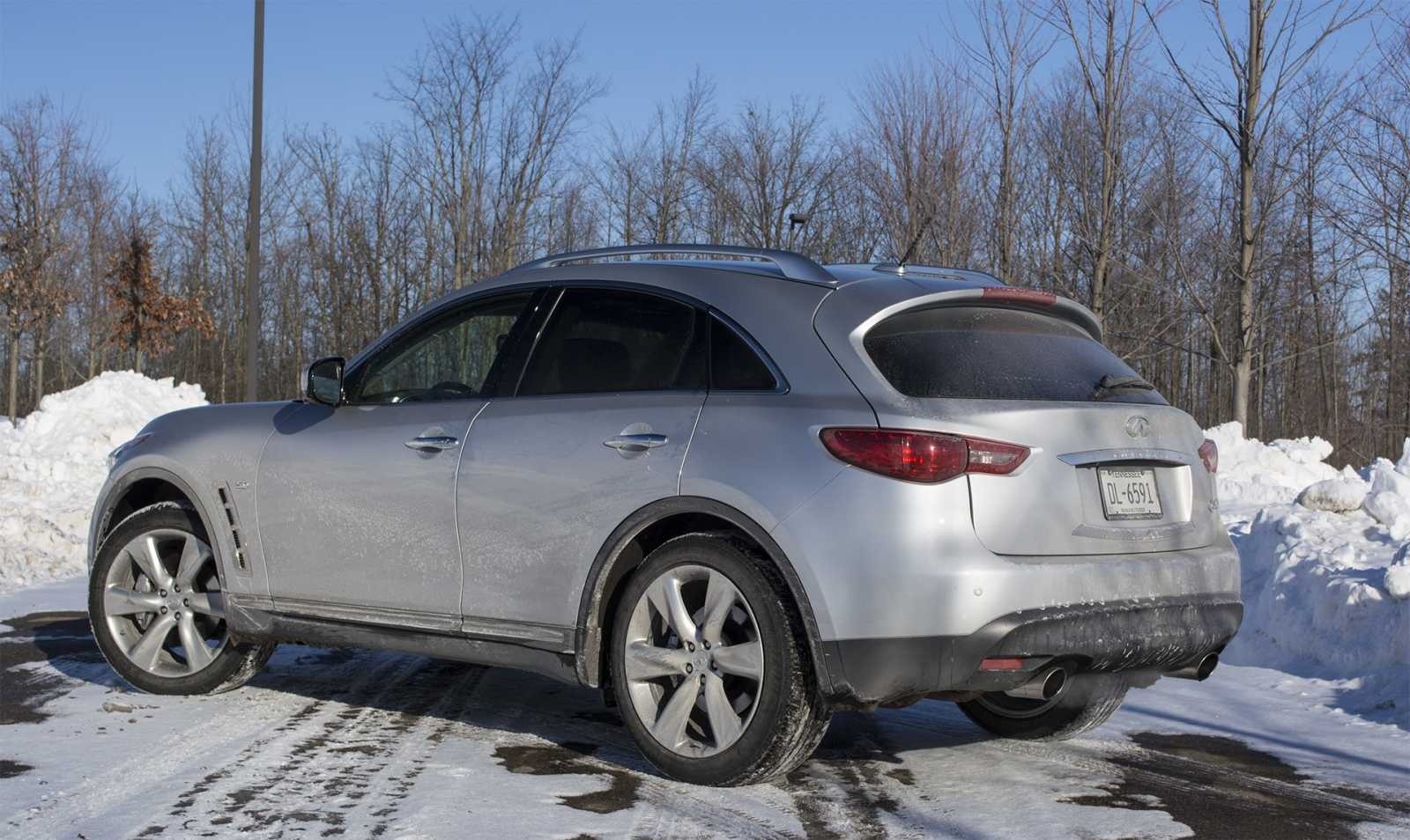 The silver QX70S is photographed from a rear three-quarter angle in a snowy parking lot with large snow piles in the background under clear blue skies. The coupe-like roofline and large alloy wheels are prominent features in this view.