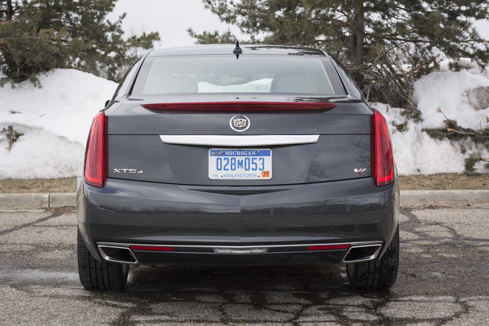 A straight-on rear view of the dark gray 2014 Cadillac XTS VSport Premium shows the full-width chrome trunk trim strip with Cadillac crest, vertical taillamp clusters, XTS4 AWD badge, and chrome-tipped dual exhaust outlets. The VSport V badge is visible on the lower right.