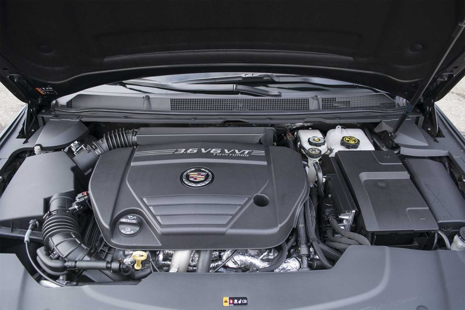 The 2014 Cadillac XTS VSport Premium is powered by a 3.6-liter V6 VVT Twin Turbo engine, clearly labeled on the engine cover with the Cadillac crest. The tidy engine bay is photographed with the hood raised, showing the turbocharged powerplant that distinguishes the VSport from the standard XTS.