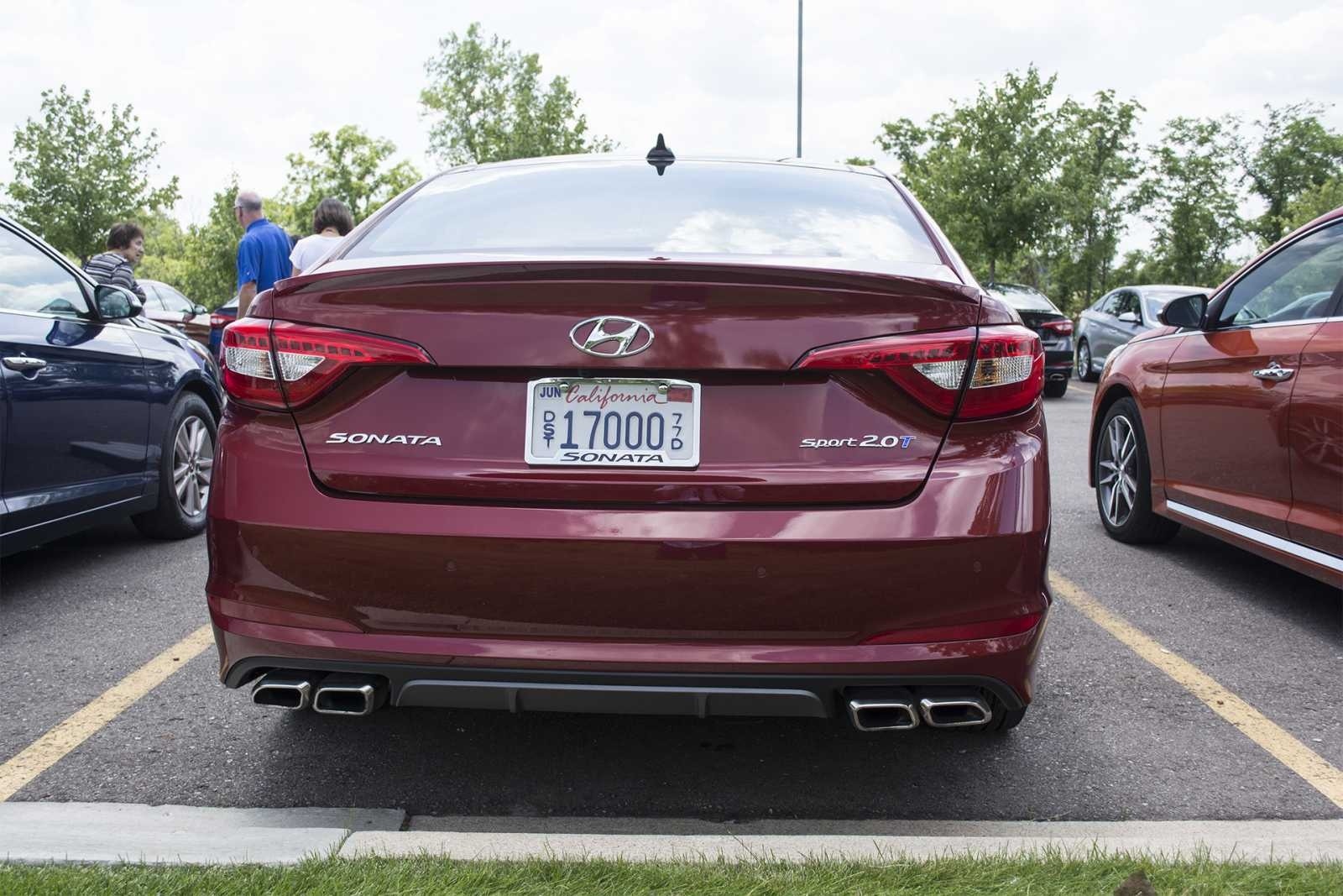 The rear of the 2015 Hyundai Sonata Sport 2.0T shows the full-width swept taillights, SONATA trunk lettering, Sport 2.0T badge, and quad chrome exhaust tips integrated into the dark rear bumper diffuser. A California license plate with a custom Sonata plate frame is visible, with additional Sonatas parked on either side at the media event.