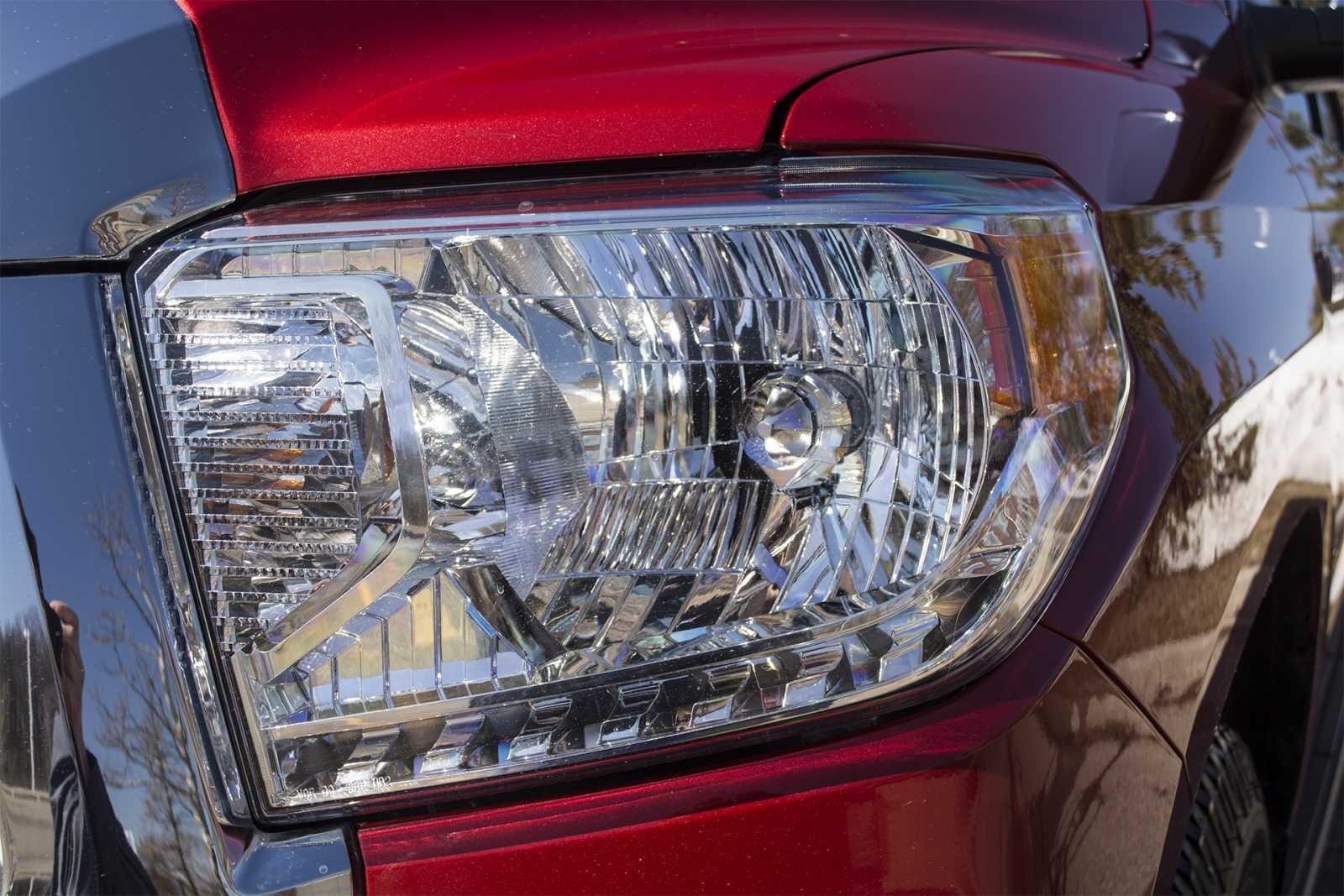 A close-up of the 2014 Toyota Tundra Limited's large rectangular composite headlight assembly shows the faceted reflector and projector beam housing on the Barcelona Red Metallic truck. The chrome trim surround and body-color hood edge frame the light unit.
