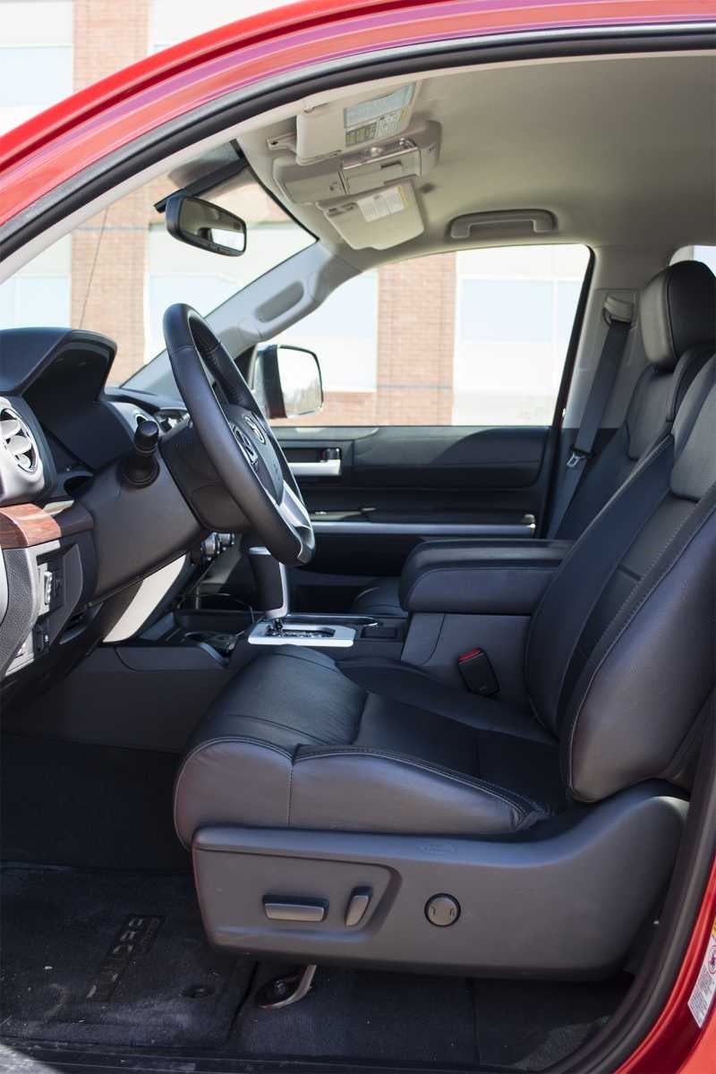 Looking through the open driver's door of the 2014 Toyota Tundra Limited CrewMax reveals a well-appointed cab with black leather front seating, a multi-function steering wheel, wood-look trim on the center console, and a wide-set dashboard. The red exterior body panels are visible at the door surround.