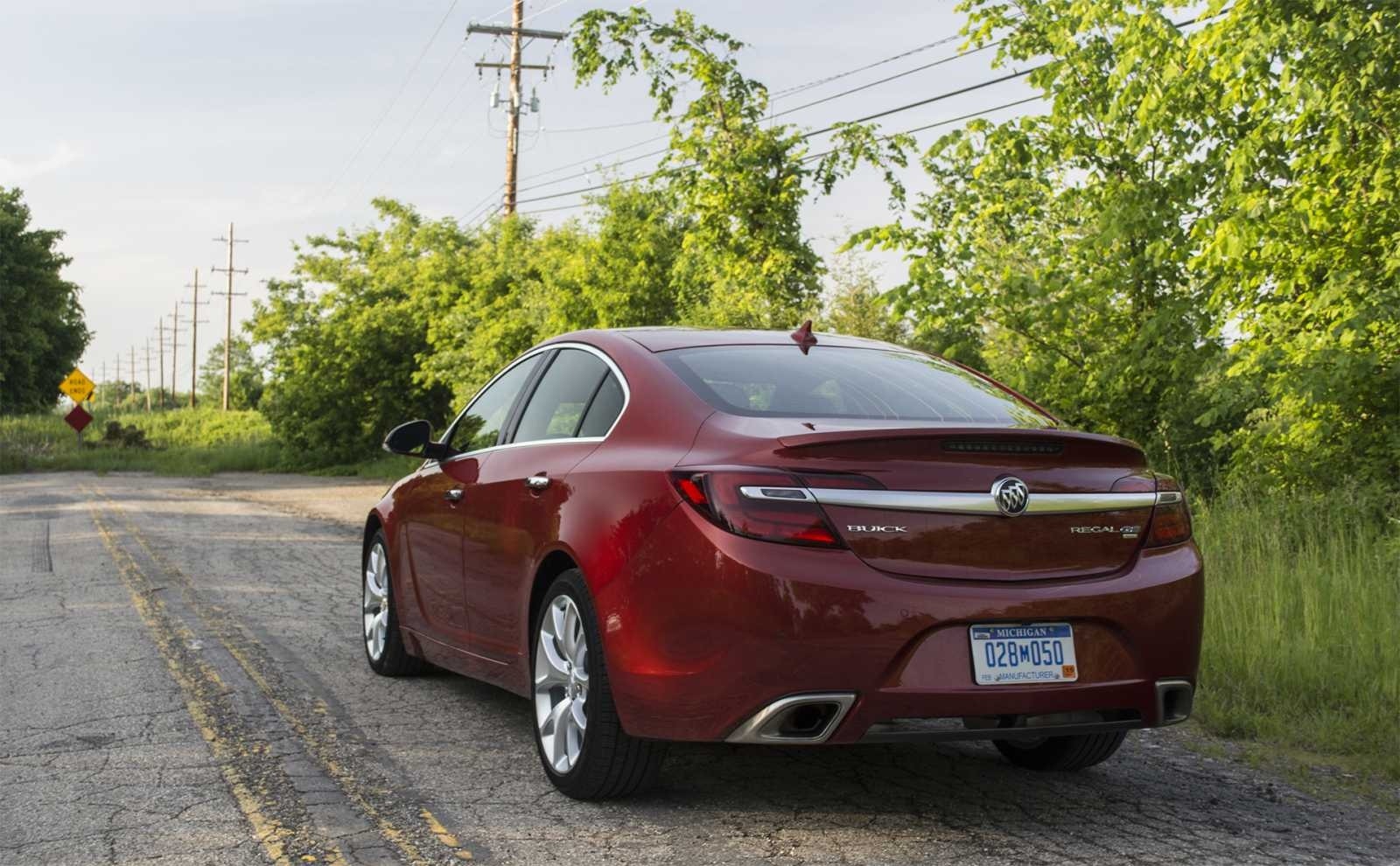 The rear three-quarter view of the 2014 Buick Regal GS AWD in Crystal Red Tintcoat shows the fastback-style roofline, chrome trunk strip, Regal GS badging, and dual rectangular exhaust outlets on a rural Michigan road. The tail lamp graphics and 19-inch GS alloy wheels are also visible.
