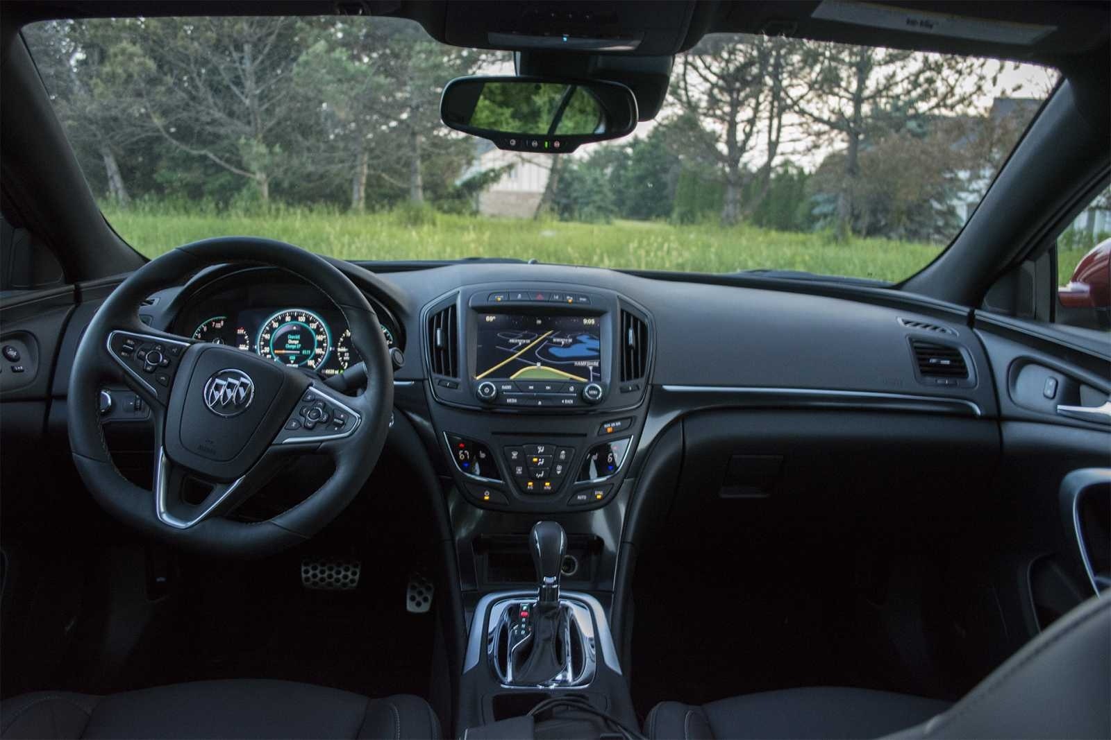 The cabin of the 2014 Buick Regal GS AWD shows the driver-focused cockpit with a Buick-logoed flat-bottom sport steering wheel, GS-specific gauge cluster with green tachometer, central navigation touchscreen, and sport-trimmed automatic shifter. The all-black interior with aluminum-look pedals reinforces the GS performance character.