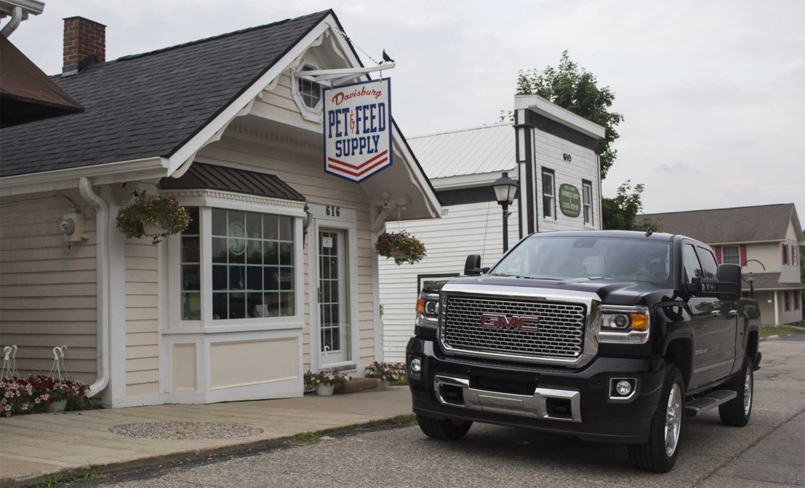 The 2015 GMC Sierra Denali 2500HD in Onyx Black is parked outside a small-town pet and feed supply store, emphasizing the truck's at-home role in rural and working environments. The imposing chrome grille and projector headlights contrast with the quaint storefront, illustrating how the Denali combines heavy-duty capability with premium Denali appointments suited to any setting.