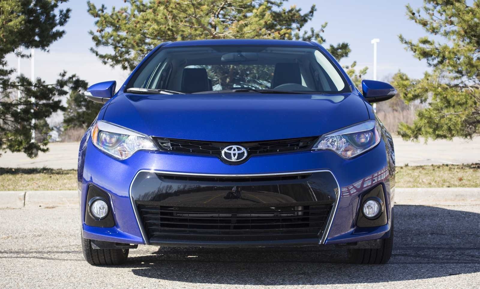 The 2014 Toyota Corolla S shows off its sport-appearance front fascia in Blue Crush Metallic, featuring the blacked-out grille, lower body kit, and integrated fog lights unique to the S trim. The all-new 11th-generation E170 Corolla brought a sharper, more aggressive look compared to its predecessor.