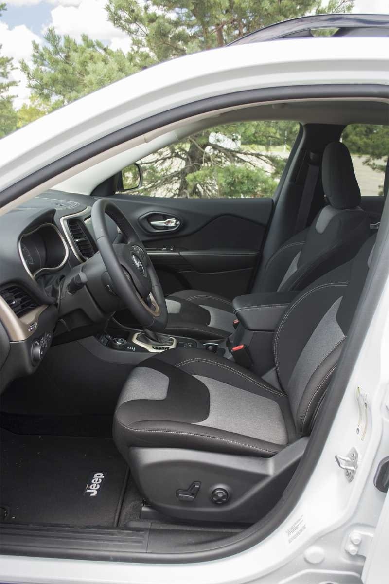 The driver's side front seat of the 2014 Jeep Cherokee Altitude shows dark grey and light grey cloth upholstery with white contrast stitching and a Jeep logo floor mat. The door is open revealing the white exterior body panel.