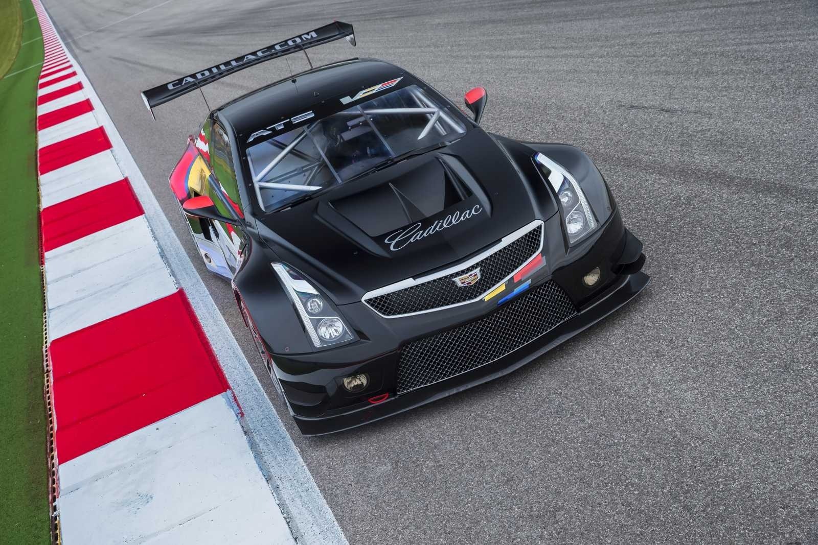 From an elevated front angle, the Cadillac ATS V.R. Coupe's vented carbon hood, wide front splitter, and Cadillac.com rear wing endplate are all clearly visible. The roll cage structure fills the cabin, reflecting the car's full FIA-specification race build.