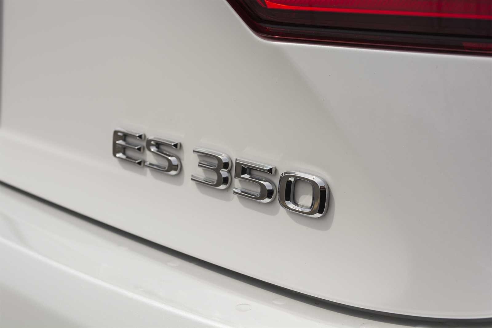 Chrome ES 350 lettering on the trunk lid of the 2014 Lexus ES 350 makes the model designation clear against the white paint. A corner of the angular LED taillight is visible in the upper right of the frame.