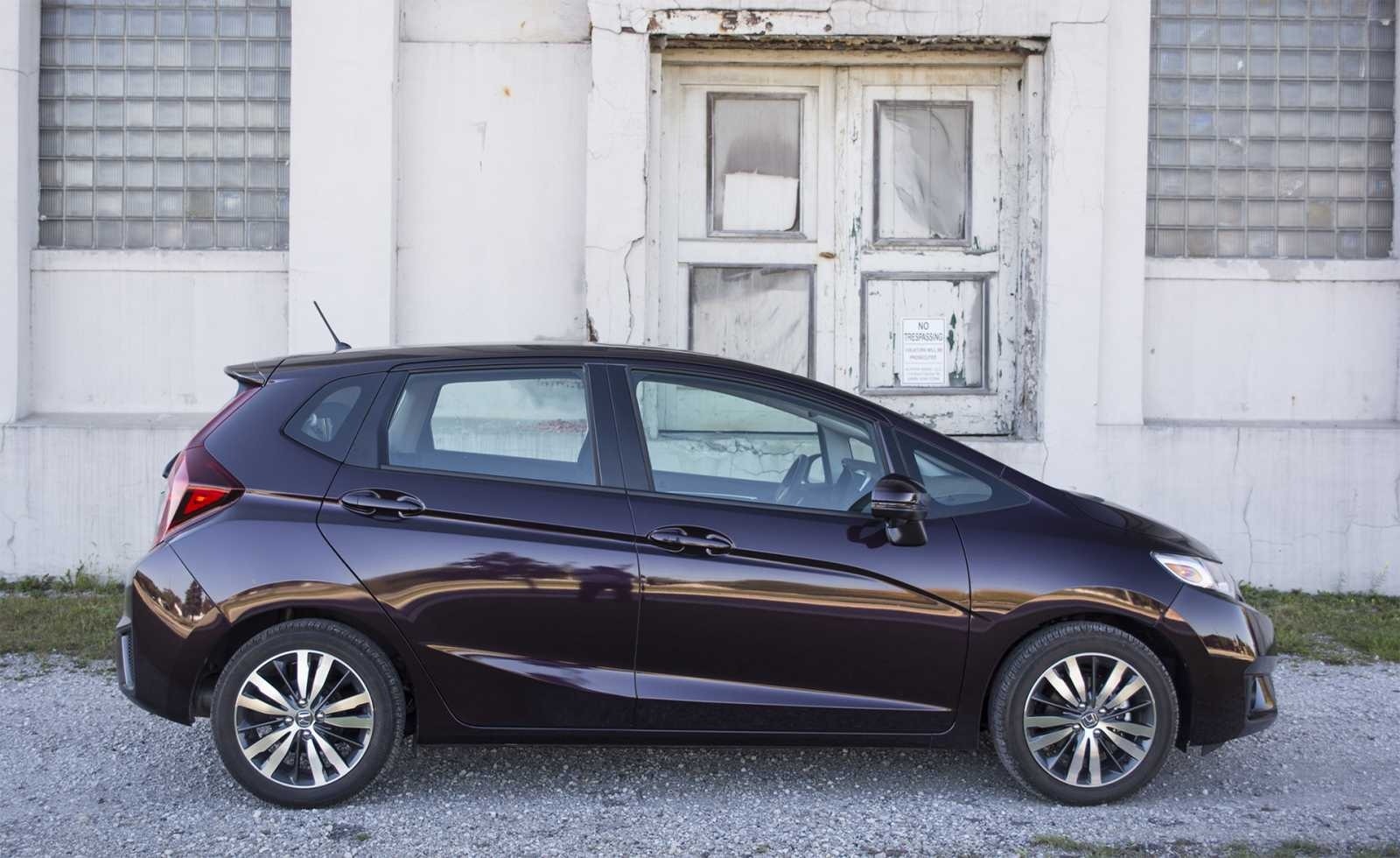 A clean driver's side profile of the 2015 Honda Fit EX-L in deep burgundy reveals the hatchback's tall glasshouse, sculpted body lines, and multi-spoke alloy wheels. The compact proportions and upright roofline give the Fit an uncommonly spacious presence for its class.